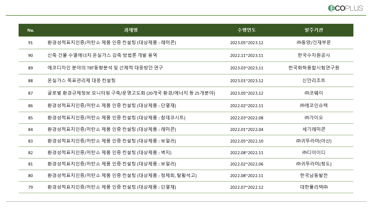 About Ecoplus Our Service Communication Contact JOIN US/ LOGIN 회사소개 연혁 조직도 오시는길 사업영역 주요실적 주요고객 주요뉴스 사내소식 공지사항 오시는길 Our Service 사업영역 주요실적 주요고객 주요실적 주요실적 게시판 입니다. Home > Our Service > 주요실적 주요고객 주요뉴스 사내소식 주요실적 갤러리게시판 공지사항 1:1문의 리뷰 2023년도 주요 실적(1) 관리자 / 2025-02-11 목록
