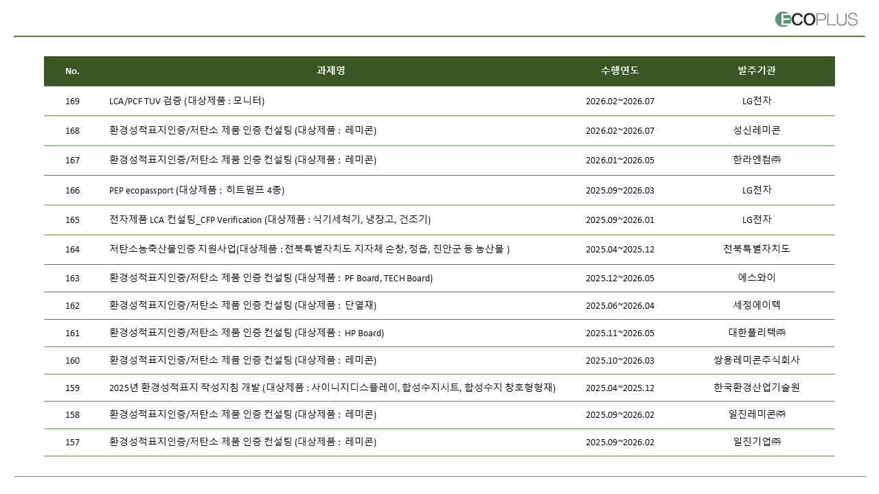 About Ecoplus Our Service Communication Contact JOIN US/ LOGIN 회사소개 연혁 조직도 오시는길 사업영역 주요실적 주요고객 주요뉴스 사내소식 공지사항 오시는길 Our Service 사업영역 주요실적 주요고객 주요실적 주요실적 게시판 입니다. Home > Our Service > 주요실적 주요고객 주요뉴스 사내소식 주요실적 갤러리게시판 공지사항 1:1문의 리뷰 2025년도 주요실적(2) 관리자 / 2026-03-12 목록